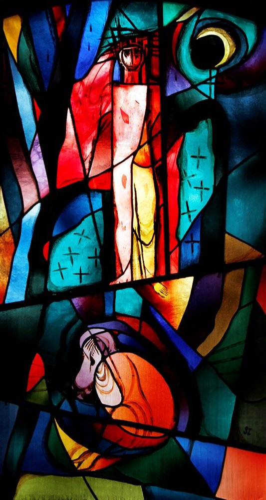 Das glühende Grün vom Bildhintergrund des Kreuzbildes wird fortgeführt in den ostseitigen Glasfenstern Michael Kienzers. Seine Glasskulpturen-Fenster erzählen nichts, stemmen sich gegen die hektische Bilderfülle unseres Medienzeitalters. In mehrere Schichten aus Glas hat Kienzer seine malerischen Gesten eingetragen, in Kommunikation untereinander, aber auch durchlässig für den Aussenraum, der mit lebensvollem Grün am Morgen prägend in den Innenraum tritt. Die Glaswand des Eingangsbereichs setzt den Dialog fort; Kapellenraum und Foyer werden zu spannender Zwiesprache geführt: Der Ort des Gebets und kontemplativer Ruhe existiert nicht abgehoben von unserer Lebenswelt, er wirkt hinaus und unser Alltag in ihn hinein.