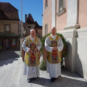 Der Vorsitzende des neuen Pfarrgemeinderates, sein "Täufling" Franz Rappold, und der Vorsitzende des Kirchenrates Adriach, Ludwig Fassl, gratulierten ihm hernach im Namen der Pfarrgemeinde zum Jubiläum und wünschten ihm Gottes Segen für sein weiteres Priesterleben und sein Wirken!