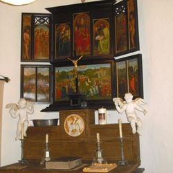 Die im 12. Jahrhundert erbaute Burg Rabenstein ist wohl eine der imposantesten Burganlagen des ganzen Murtales. Die Altburg, aus der heute ein moderner Stahl-Glas-Bau von Burgherrn DI Werner Hochegger ragt, brannte ab und wurde nicht wieder aufgebaut. Die heutige Burg wurde im 14. Jahrhundert errichtet und befand sich in landesfürstlichem Besitz. Aus dieser Zeit stammt vermutlich auch die über dem Südtor liegende Burgkapelle. Sie ist somit die älteste Privatkapelle in unserer Pfarrgemeinde. Urkundliche Erwähnungen dieser Kapelle sind aus den Jahren 1519 bis 1888 mit der Bezeichnung als „Heilig-Kreuz-Kapelle“ bzw. als Kapelle zur „Heiligen Kreuzabnahme“ vorhanden. Ein großes Gemälde in der Kapelle zeigt dieses Motiv der Kreuzabnahme. Leonhard von Harrach, Verweser in Steiermark und Hauptmann zu Pettau, stiftete am 18. Dezember 1519 eine tägliche Messe, die am Donnerstag in der St. Georgs-Pfarrkirche, an Sonn- und Feiertagen sowie an Werktagen, an denen der Stifter nicht an der Zelebration in Adriach teilnehmen konnte, in der Burg Rabenstein abzuhalten war. Er stattete diese Stiftung großzügig mit einer Hofstatt im Forstgraben als Kaplanswohnung und 28 Pfund Pfennigen Herrengült aus. Nach der Visitation am 25. Oktober 1618 durch den Seckauer Fürstbischof ging der Besitz der Kapelle von etlichen Bauern an die Herrn von Windischgräz über. Anlässlich einer Visitation vom 12. Jänner 1756 wurde die Burgkapelle zum „Sacellum publicum“, d.h. zu einer öffentlichen Kapelle erklärt, in der wenigstens drei Messen im Jahr gefeiert werden sollten. Im Oktober 1869 beantragte der kunstsinnige k.k. Burghauptmann Ludwig von Montoyer beim fürstbischöflichen Ordinariat in Graz einige bauliche Änderungen, wodurch sie ihr heutiges Aussehen erhielt. Sie ist ca. 19 m² groß, 3,75 m hoch und bietet Platz für maximal 10 Personen. Im Mittelpunkt der Burgkapelle hängt ein beeindruckender Flügelaltar. Es handelt sich dabei um eine originalgetreue Nachbildung des berühmten Genter Altars (Belgien), der 1432 am Höhepunkt der Flämischen Schule von Jan van Eyck geschaffen wurde. Auf dem Altaraufsatz ist die Anbetung des Gotteslammes zu sehen, einem Symbol für Jesus Christus in der Schlussszene der Offenbarung des Johannes, und der Einzug der Auserwählten nach dem Jüngsten Gericht in das Neue Jerusalem. Der beherrschende Mittelteil des Bildes zeigt Gottvater als thronenden Weltenherrscher sowie die heilige Maria und Johannes den Täufer. Auf den Seitenflügeln wird diese Gruppe von musizierenden Engeln sowie von Adam und Eva begleitet. Man sieht den gut erhaltenen Flügelaltar nun immer mit der Festtagsseite, also mit geöffneten Flügeln, die man früher nur zu den großen Festen Ostern, Weihnachten und Allerheiligen zeigte. Auf der Alltagsseite, den geschlossenen Flügeln, gibt es insgesamt 12 Bilder. Sie zeigen unter anderem Johannes den Täufer, Johannes den Evangelisten und Mariä Verkündigung. Der Andachtsraum besitzt einen Steinboden, drei Fenster sorgen für Tageslicht und in der Mitte der Kapelle hängt eine kunstvolle Ampel. Es gibt mehrere Heiligenbilder, schön gearbeitete Holzsessel und einen kleinen Holzaltar mit Altarkreuz. Am 9. März 1888 erhielt der neue Besitzer der Burg, Fritz Reininghaus, vom fürstbischöflichen Ordinariat die Erlaubnis, in der Burgkapelle jährlich wenigstens zehn Messen feiern zu dürfen, besonders an Familiengedächtnistagen. Nach dem Tod von Sigurd Reininghaus 1981 sollen für den Verstorbenen auf Initiative der damals im Schloss Waldstein lebenden Ex-Kaiserin Zita eine oder zwei Messen in der Kapelle gefeiert worden sein. Vor der Übernahme der Burg Rabenstein durch den Grazer Unternehmer DI Werner Hochegger im Jahr 2005 sind aus der Kapelle leider einige sakrale Gegenstände abhanden gekommen. Der jetzige Eigentümer hat jedoch dankenswerterweise dafür gesorgt, dass die Burgkapelle wieder renoviert wird, so dass man sie wieder als Messkapelle nützen könnte. Auf diese Weise ist dafür gesorgt, dass die ca. 700-jährige Geschichte dieser wunderbaren Kapelle eine Fortsetzung finden kann. |