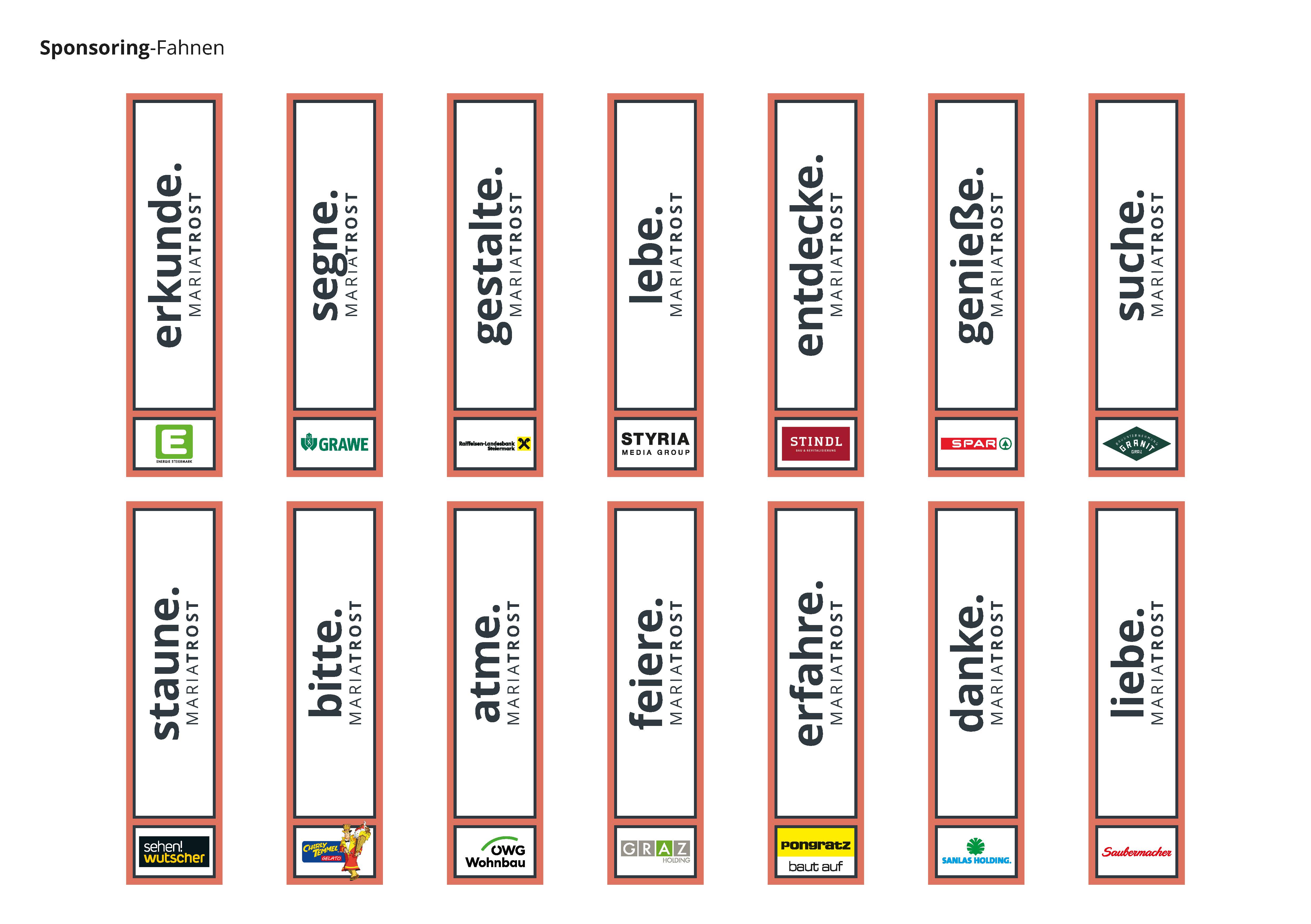 15 Unternehmen und Institutionen helfen – optisch fein sichtbar gemacht durch 18 Fahnen – mit, auf die Tiefenwirkungen von MARIATROST aufmerksam zu machen: 4 THEMEN-Fahnen stimmen die Besuchenden auf das Kirchenjahr ein und 14 SPONSORING-Fahnen signalisieren die verlässliche Projektbegleitung durch die Sponsoren.