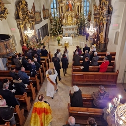 Mit einem königlichen Einzug begann der Sternsingergottesdienst am Dreikönigstag. Diakon Michi Zepf zelebrierte die Wort-Gottes-Feier mit Kommunionspendung zum „Hochfest der Erscheinung des Herrn“. In vielen Texten und Liedern kam das Anliegen der Dreikönigsaktion zum Ausdruck. Noch einmal trat eine Sternsingergruppe auf und präsentierte ihre Botschaft. Die Segnung des Dreikönigswassers und des Salzes, das auch zum Mitnehmen angeboten wurde, bildete zusammen mit der Allerheiligenlitanei, vorgetragen von Martin Kirchberger, den feierlichen Abschluss der WGF.