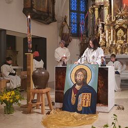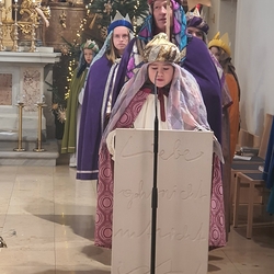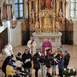 Mit einem königlichen Einzug begann der Sternsingergottesdienst am Dreikönigstag. Diakon Michi Zepf zelebrierte die Wort-Gottes-Feier mit Kommunionspendung zum „Hochfest der Erscheinung des Herrn“. In vielen Texten und Liedern kam das Anliegen der Dreikönigsaktion zum Ausdruck. Noch einmal trat eine Sternsingergruppe auf und präsentierte ihre Botschaft. Die Segnung des Dreikönigswassers und des Salzes, das auch zum Mitnehmen angeboten wurde,  bildete zusammen mit der Allerheiligenlitanei, vorgetragen von Martin Kirchberger, den feierlichen Abschluss der WGF.
