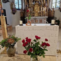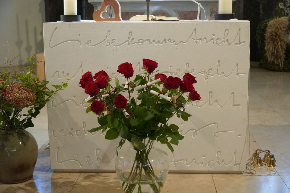 Viele Rosen schmückten die Kirche beim Ehejubiläumsgottesdienst, den wir am 22. Oktober mit Vikar Norbert Glaser feiern durften.