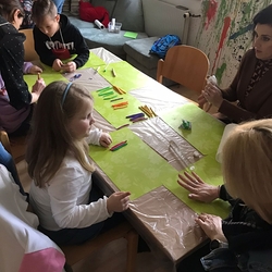 Dieser Arbeitsvorgang hat wirklich einiges von unseren Kindern abverlangt. Sie mussten sich für eine Farbe bei Stoff und Faden entscheiden, dann schneiden, den Stoff mit Schlingstichen zu einer Tasche zusammennähen, sich einen Knopf aussuchen und diesen auch alleine annähen und schlussendlich sehr mutig sein, da sie für den Knopf noch ein Loch in ihre Tasche schneiden mussten. Dann fast am Ende überlegten sich die Kinder auch noch ein Motiv, das sie auf ihre Taschen klebten und drehten ihre Schnüre, damit sie ihre Taschen auch umhängen konnten. Jede Tasche ist einmalig und wunderschön geworden.