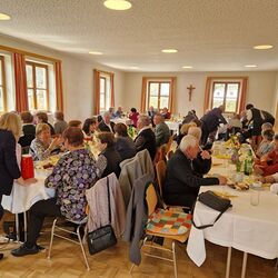 Nach der geistig-seelischen Stärkung in der Kirche genossen die75+ Gäste die leibliche Stärkung im Pfarrheim, für die der Sozialkreis, geleitet von Elisabeth Schöpf, wieder bestens sorgte. Ein kleiner Witz von Vikar Hatzmann und die musikalische Untermalung von Jakob Mayer am Keyboard sorgten sogleich für Auflockerung und gute Stimmung.
