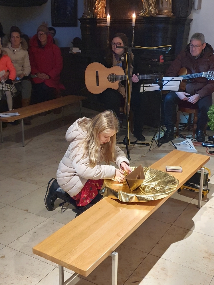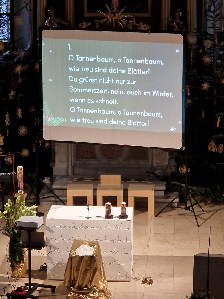 In seiner Predigt sprach Vikar Gerhard von Gott, der als kleines, hilfloses Kind zur Welt gekommen ist, in Armut und Bedürftigkeit. Eine mitgebrachte Windel symbolisiert dies. - Gott ist einer von uns, er kommt uns entgegen. Er ist ein Gott, an den wir uns anlehnen können. Er umarmt uns und stillt unser Verlangen nach Geborgenheit, Liebe und Frieden. …