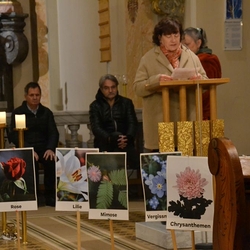 Im Zentrum der schön gestalteten Feier standen ein Taufgedächtnis mit Weihwasserritus, ein Evangelium (Mt, 6, 26-33), Blumentexte (in denen man sich mit der einen oder anderen Blumenbeschreibung ganz gut identifizieren konnte), Dankesworte sowie Fürbitten.