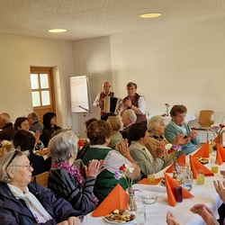 Im Anschluss waren die ehrenamtlichen Mitarbeiterinnen und Mitarbeiter beider Pfarren zum gemütlichen Beisammensein ins Kulturheim Wundschuh geladen. Dort konnte man - bei fröhlicher Musik der Lichtmessgeiger - köstliche Brötchen, Sekt und Krapfen genießen und den Rosenmontag mit angeregten Gesprächen ausklingen lassen.